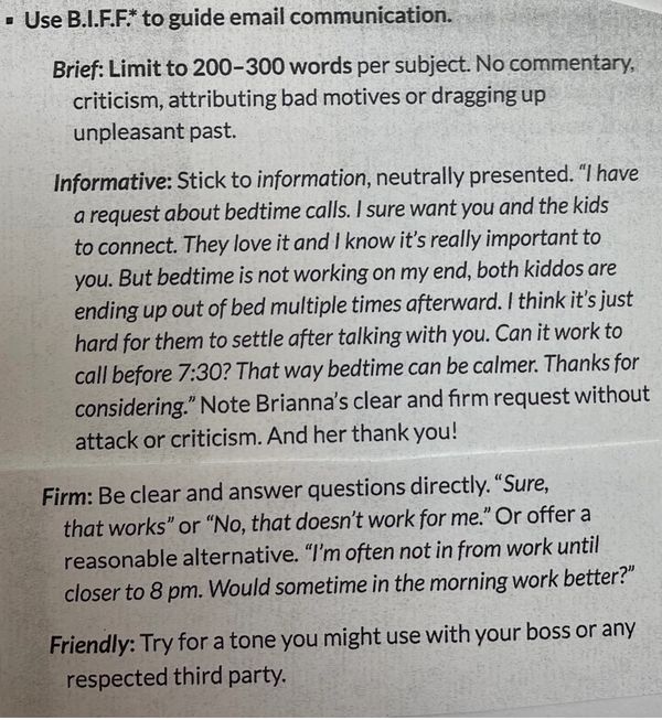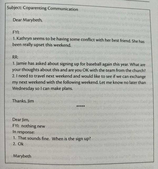 When you only communicate once or twice a week, it can be a lot of information at once. In order to prevent information from getting lost and to make it clear what information needs a response, structure the conversation similar to the photo above. The photo is from the book, The Coparents' Communication Handbook (see above).